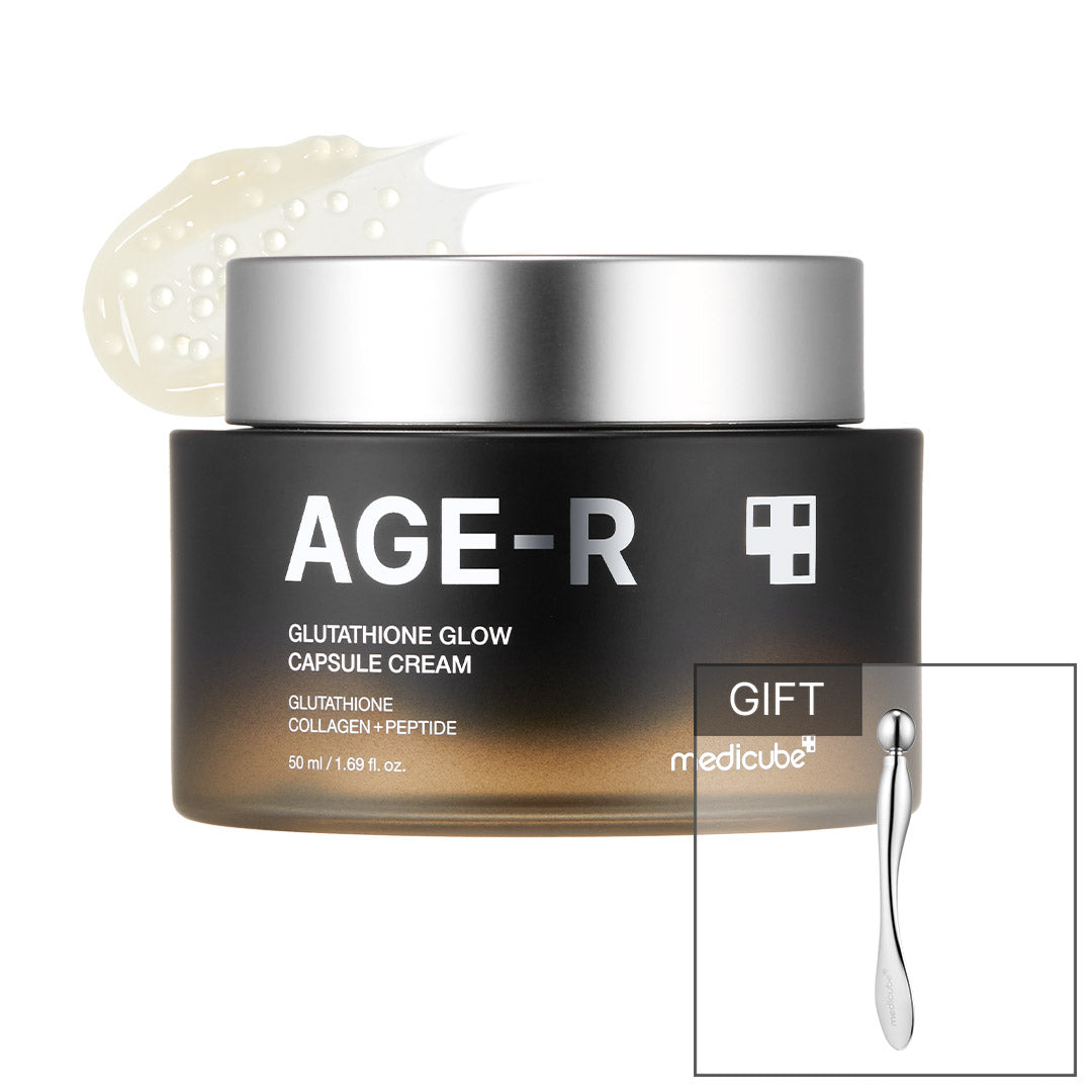 AGE-R Glutathione Glow Capsule Cream | Water, Glycerin, Glycereth-26, Butylene Glycol, Methylpropanediol, Vinyl Dimethicone, Niacinamide, 1,2-Hexanediol, Betaine, Isononyl Isononanoate, Isohexadecane, Sodium Polyacrylate, mmonium Acryloyldimethyltaurate/VP Copolymer, Phenyl Trimethicone, Dimethiconol, Flavor, Chondrus Crispus Powder, C18-21 Alkane , Glutathione(1,009.9ppm), Ethylhexylglycerin, Polyglyceryl-10 Laurate, Glyceryl Acrylate/Acrylic Acid Copolymer, Agar, Xanthan Gum, Hydrogenated Lecithin, Polyglyceryl-10 Oleate, Adenosine, Tromethamine, Acrylates/C10-30 Alkyl Acrylate Crosspolymer, Glucose, Limonene, Gellan Gum, Thioctic Acid, Caprylic/Capric Triglyceride, Ceramide NP, Sorbitan Laurate, Hydroxyethylcellulose, Acetyl Dipeptide-1 Cetyl Ester, Palmitoyl Tripeptide-5, Acetyl Hexapeptide-1, Soluble Collagen