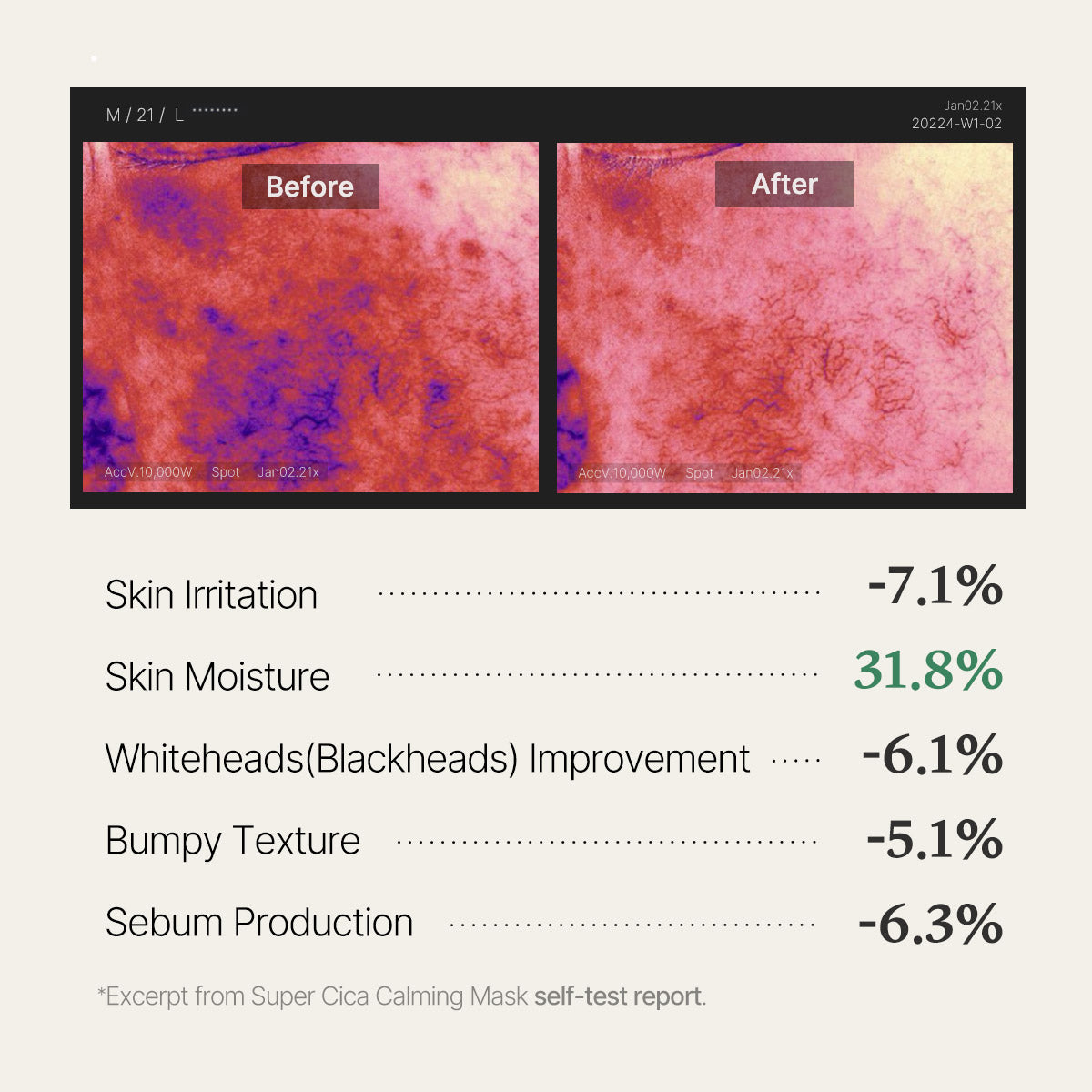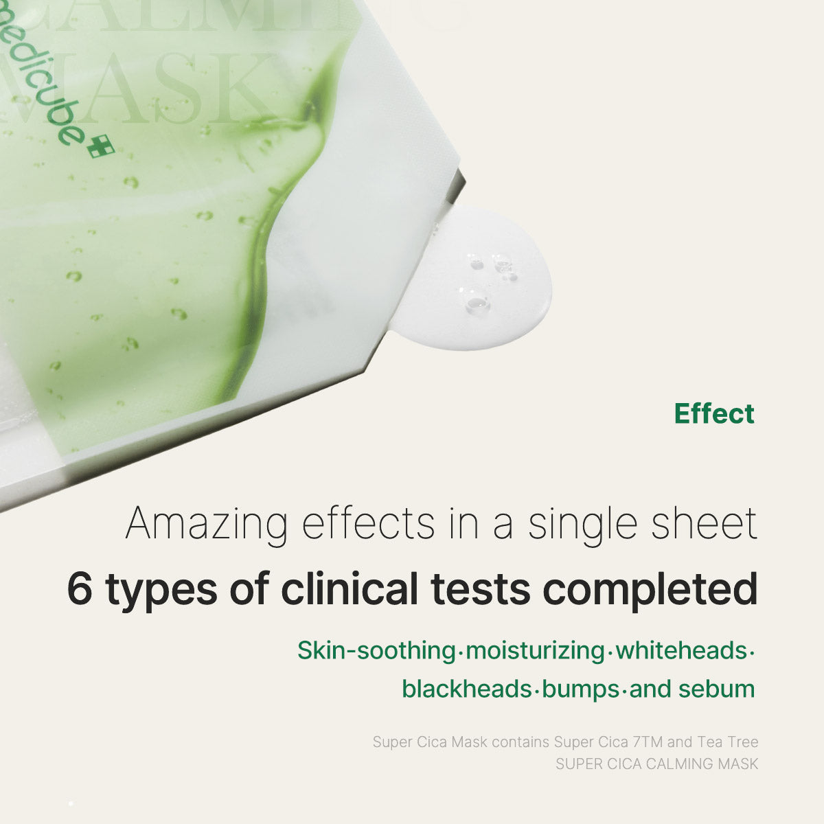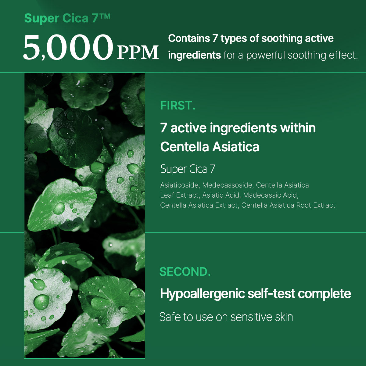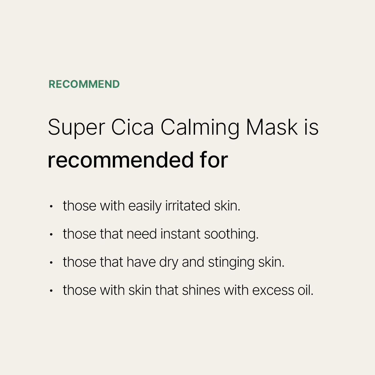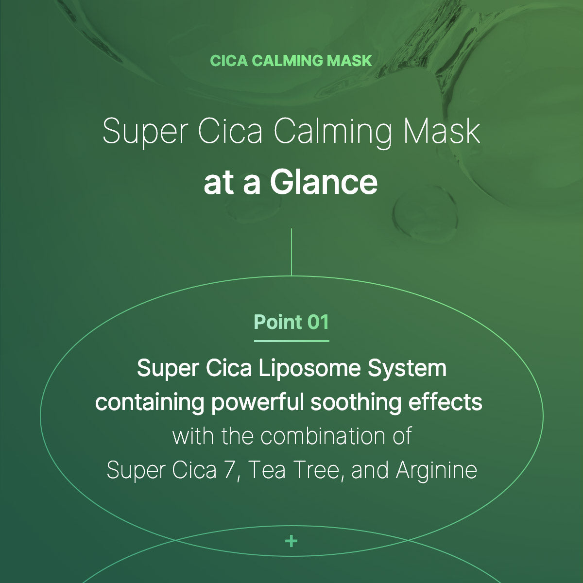 Super Cica Calming Mask I Water, Glycerin, Methylpropanediol, 1,2-Hexanediol, Arginine, Carbomer, Propanediol, Polyglyceryl-10 Laurate, Allantoin, Ethylhexylglycerin, Panthenol, Hydroxyethylcellulose, Disodium EDTA, Dipotassium Glycyrrhizate, Vitis Vinifera (Grape) Seed Oil, Melaleuca Alternifolia (Tea Tree) Leaf Oil, Dipropylene Glycol , Butylene Glycol, Houttuynia Cordata Extract, Melaleuca Alternifolia (Tea Tree) Leaf Extract, Polyglyceryl10 Oleate , Centella Asiatica Root Extract , Centella Asiatica Leaf Extract, Centella Asiatica Extract , Sodium Acetate, Pentylene Glycol , Sodium Hyaluronate, Madecassoside , Cellulose, Polyglyceryl-4 Caprylate, Lecithin, Tocopherol, Stearic Acid, Hydrolyzed Collagen, Portulaca Oleracea Extract, Hydrolyzed Elastin, Asiatic acid , Asiaticoside , Madecassic acid